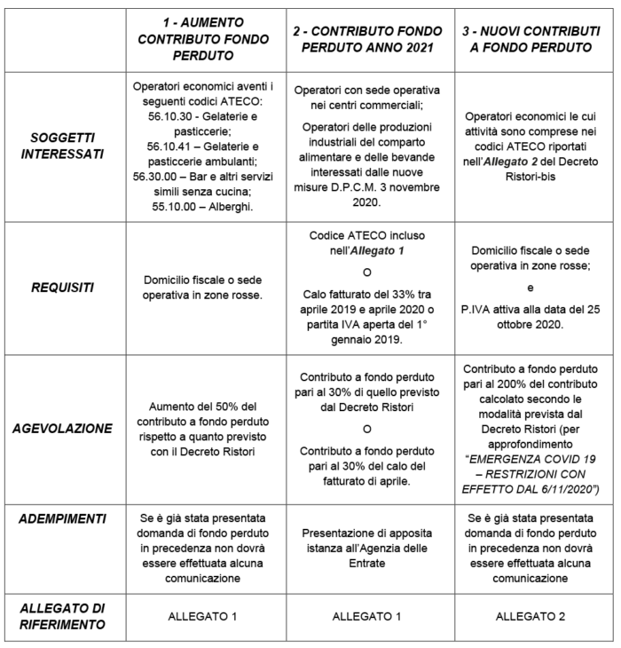 - un aumento del contributo a fondo perduto già riconosciuto con il Decreto Ristori per alcune categorie di soggetti operanti nei settori economici colpiti dalle limitazioni previste dai P.C.M. 24.10.2020 e 03.11.2020;