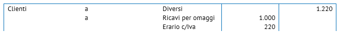 Se l’azienda compra un bene destinato a omaggio all’atto dell’acquisto, unitamente all’uscita finanziaria di cassa o banca, rileverà la voce di Conto economico accesa agli omaggi facendo sempre attenzione alla detraibilità dell’Iva.