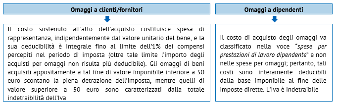 Nel caso in cui i destinatari degli omaggi siano i dipendenti dell’impresa, il costo di acquisto di tali beni va classificato nella voce “spese per prestazioni di lavoro dipendente” e non nelle spese di rappresentanza; pertanto, tali costi saranno interamente deducibili dalla base imponibile al fine delle imposte dirette, a prescindere dal fatto che il bene sia o meno oggetto di produzione e/o commercio da parte dell’impresa.