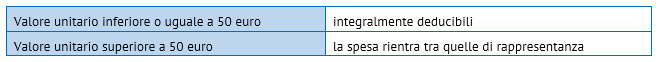 - integralmente deducibili dal reddito di impresa nel periodo di sostenimento, se di valore unitario non superiore a 50 euro;