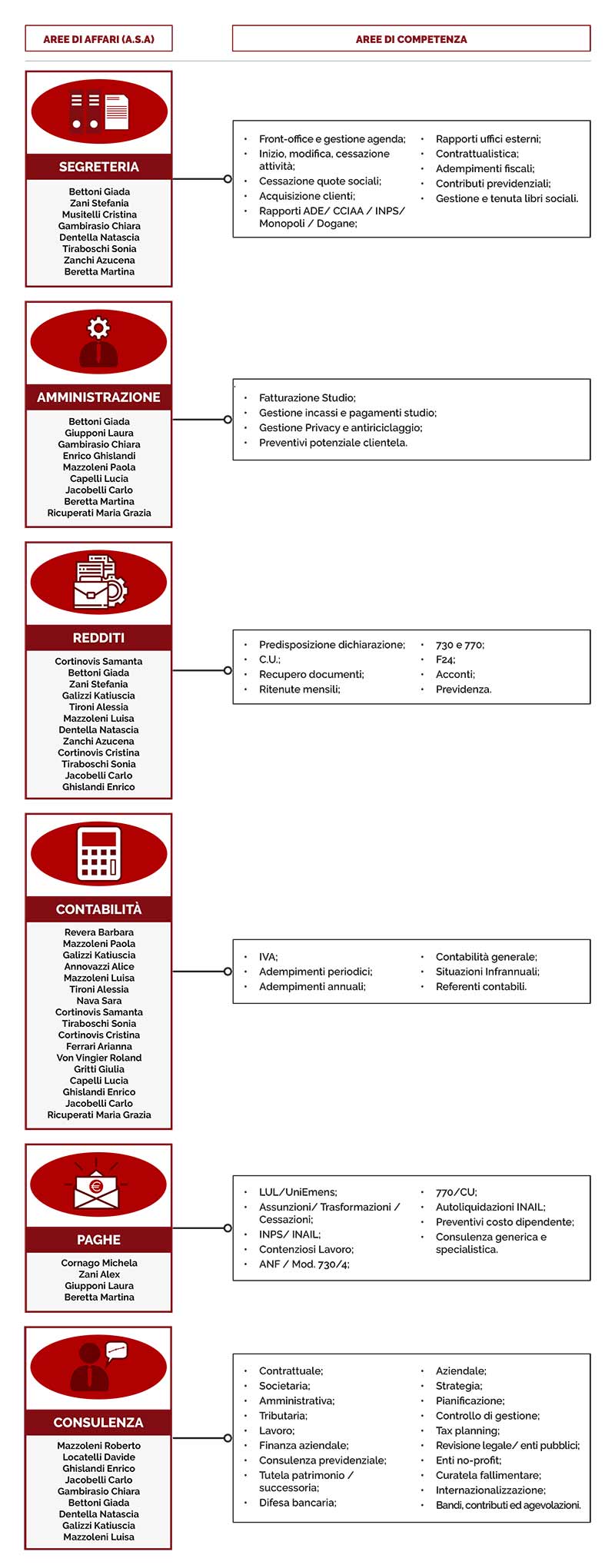 Ieri come oggi il successo dello Studio commercialista Bergamo Mazzoleni & Partners si deve alla competenza del fondatore e dei suoi collaboratori. Ma anche ad un organigramma che assegna a ognuno un preciso ruolo.