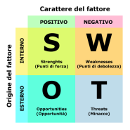 Un analisi di questo tipo permette di mappare i punti di forza e di debolezza della nostra azienda (ambiente interno) e le opportunità o le minacce per la nostra azienda dall’ambiente esterno.